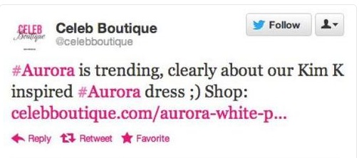 One of the main aspects of running a social media campaign is to keep on track with current news. This makes engagement much more relevant and interesting. Celeb Boutique clearly weren’t watching the news when the story of the Aurora massacre in the US broke.